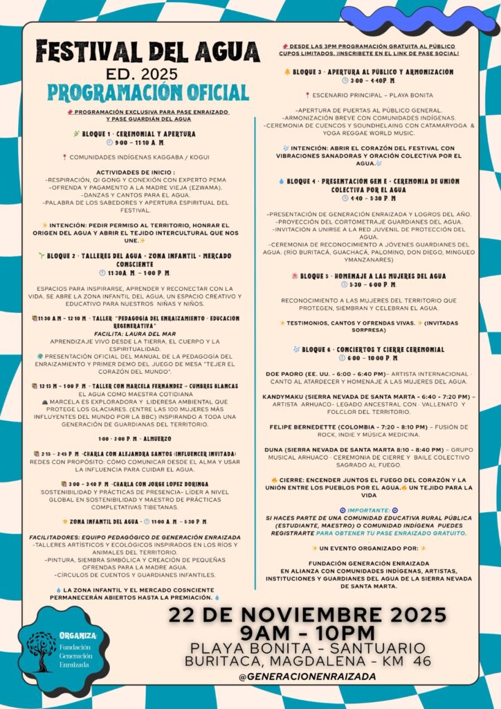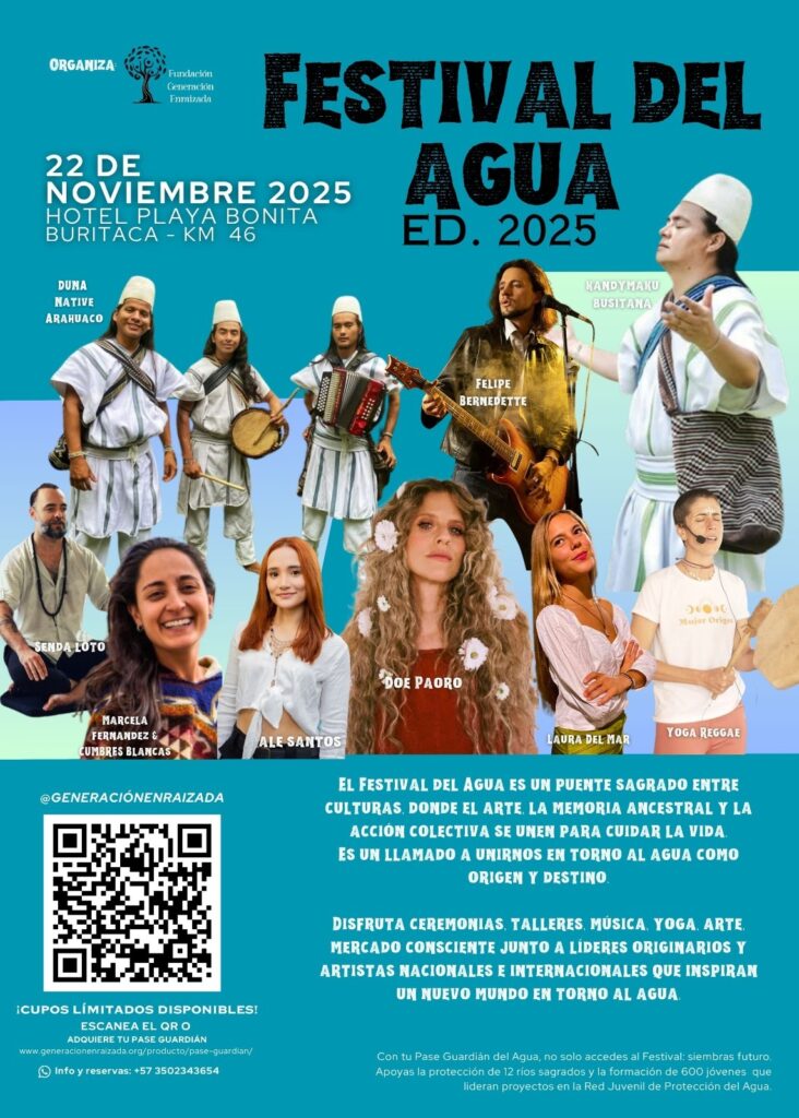 El Festival del Agua 2025 se celebrará el 22 de noviembre en Playa Bonita, Sierra Nevada de Santa Marta. Es un evento crowdfunding creado para honrar al agua como fuente de vida y, al mismo tiempo, apoyar directamente los proyectos de nuestra Fundación Generación Enraizada y su sostenimiento en 2026.
